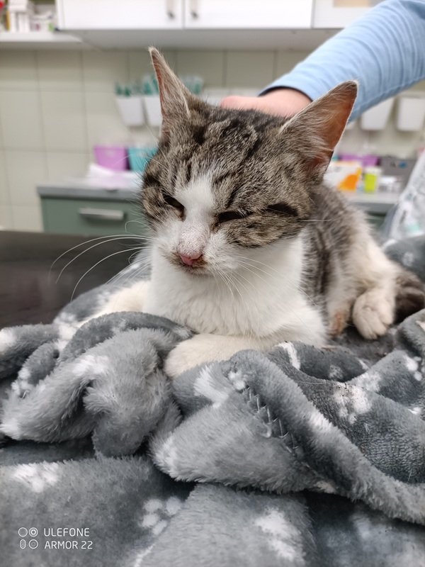 Kotě ve věku 6 měsíců s váhou 1,4 kg bylo ve velmi špatném stavu. V současné době je na kapačce a ohříváme poduškou, nasazeny antibiotika.