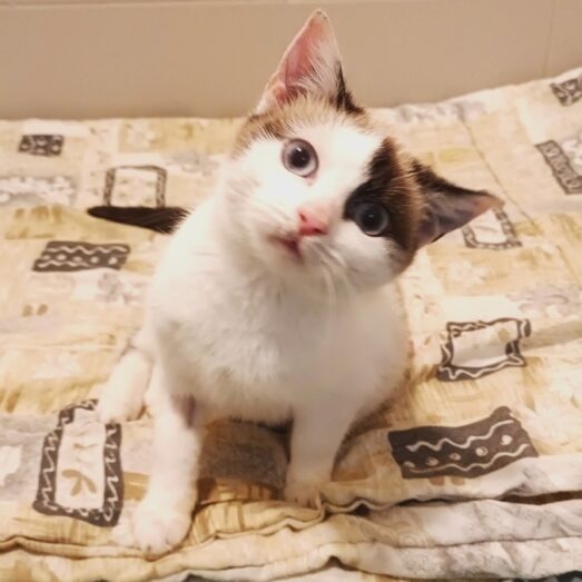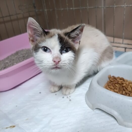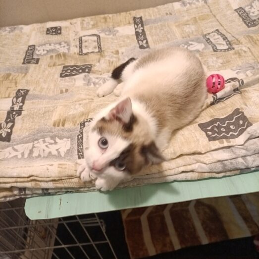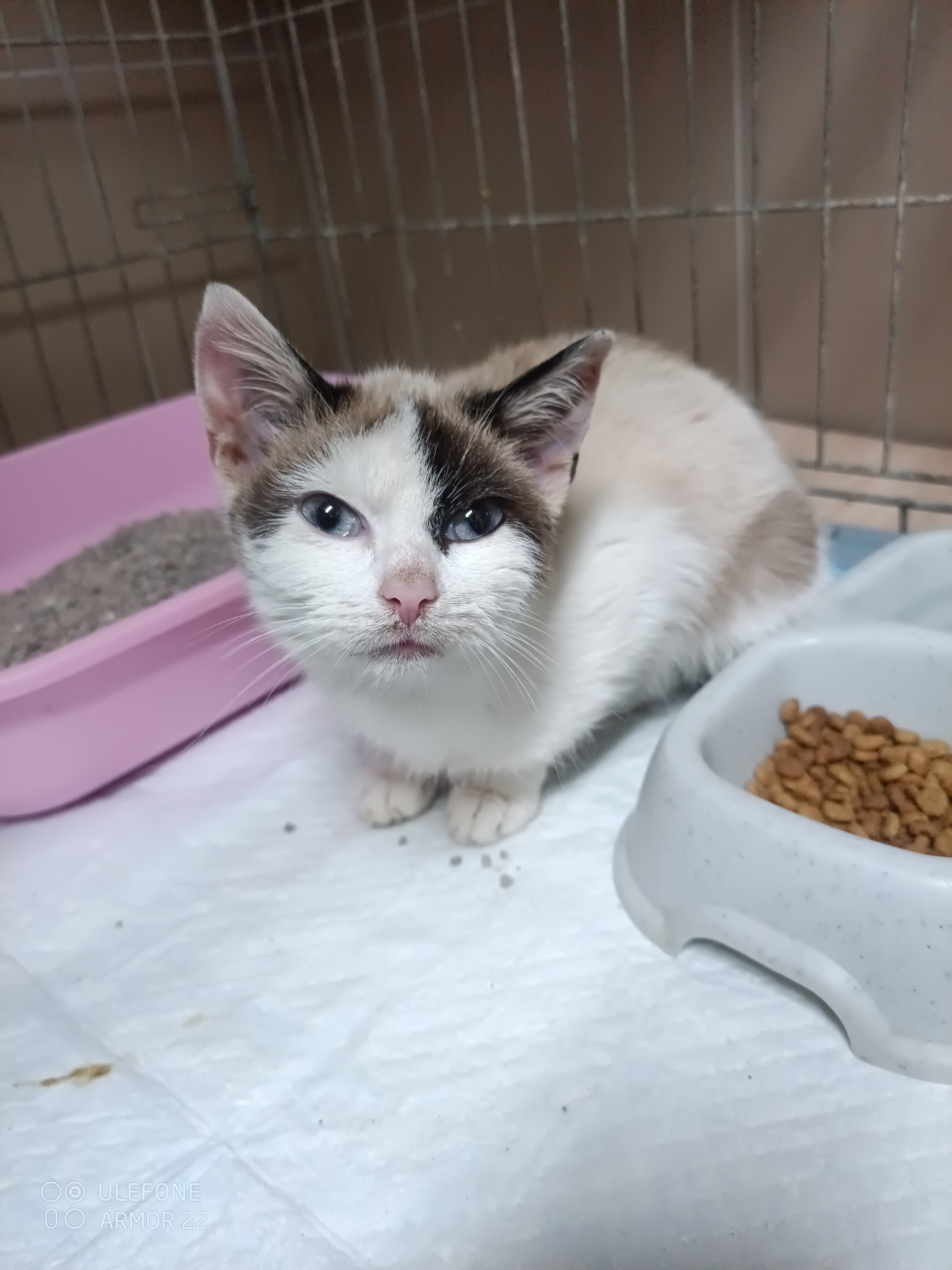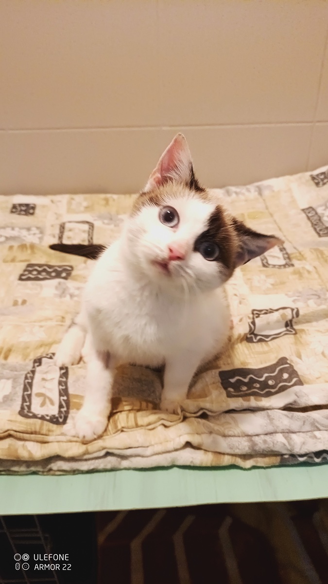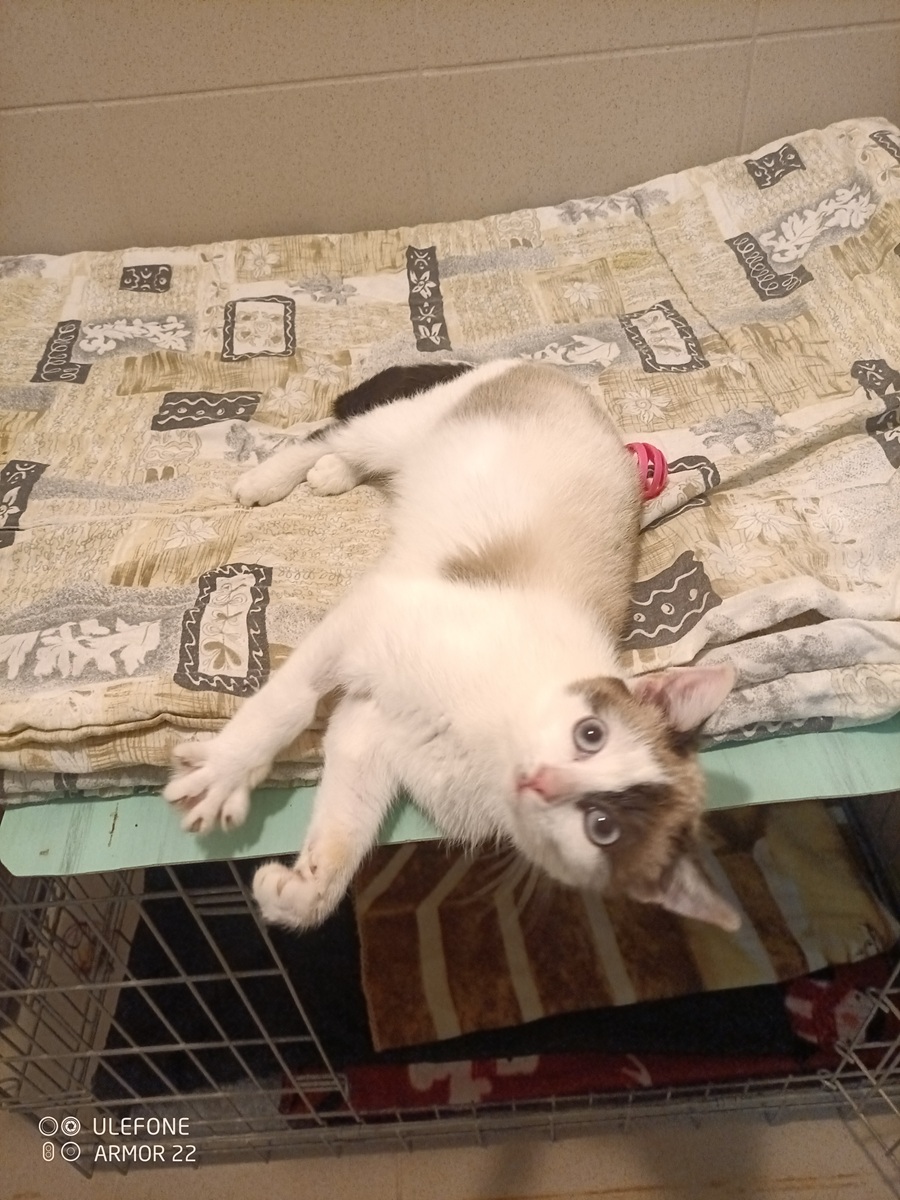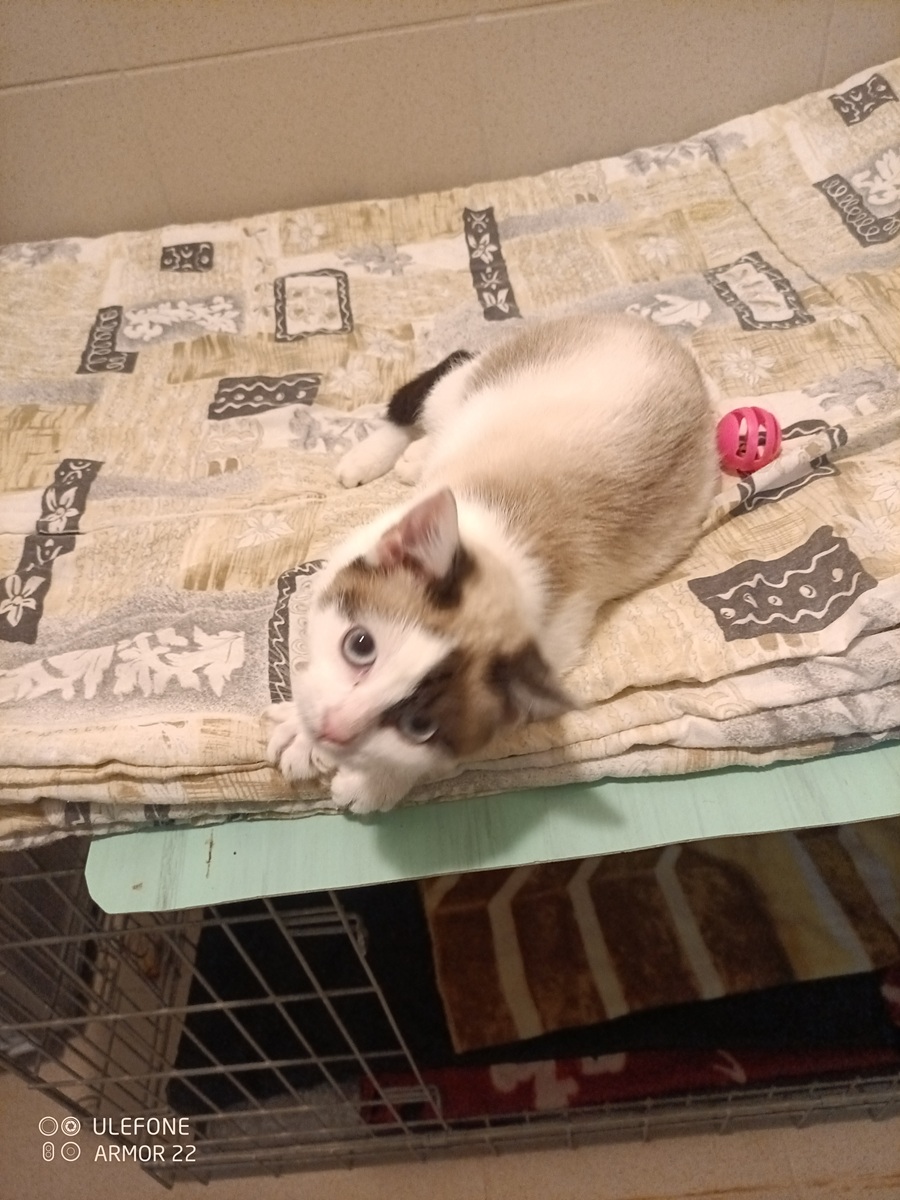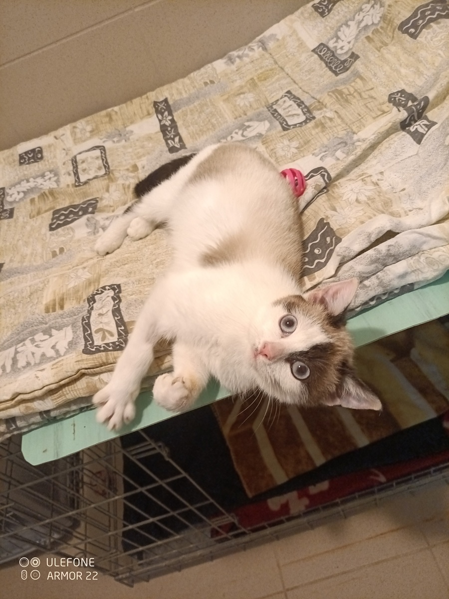Věk 1 rok, váha 1,2 kg. Kočička je velice drobná a nemocná. Obtížně polyká a má zapáchající průjem. Nasazeny ATB, léky proti zvracení.